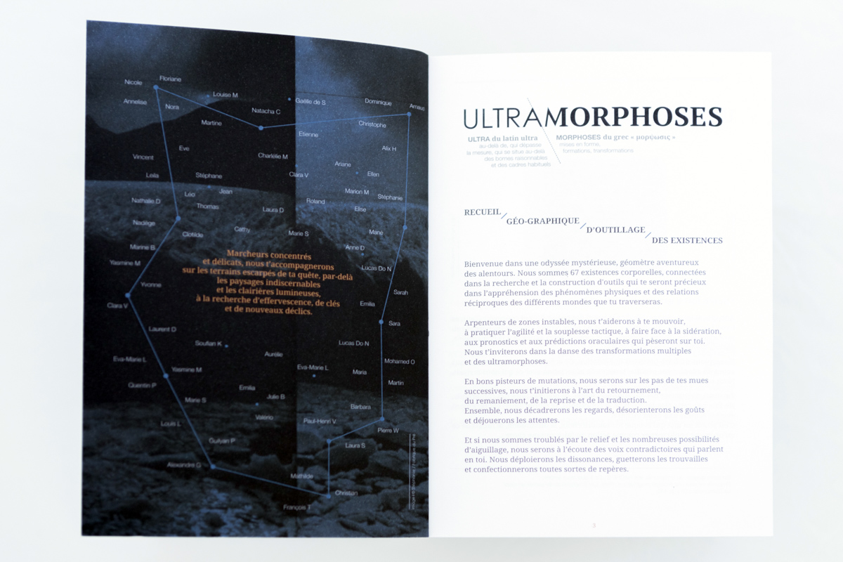 Ensemble, nous décadrerons les regards, désorienterons les goûts et déjouerons les attentes. Et si nous sommes troublés par le relief et les nombreuses possibilités d’aiguillage, nous serons à l’écoute des voix contradictoires qui parlent en toi. Nous déploierons les dissonances, guetterons les trouvailles et confectionnerons toutes sortes de repères.